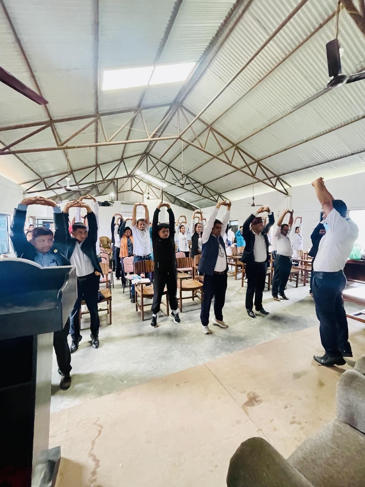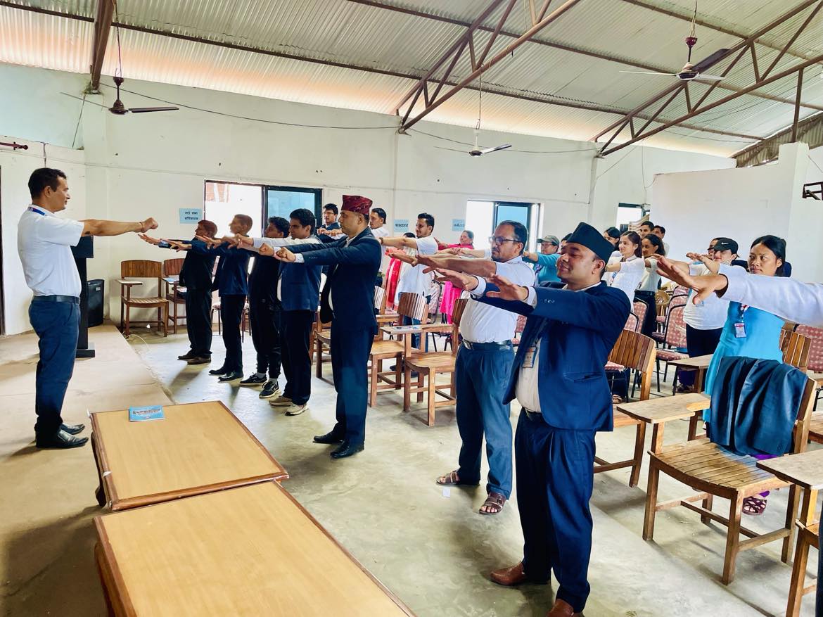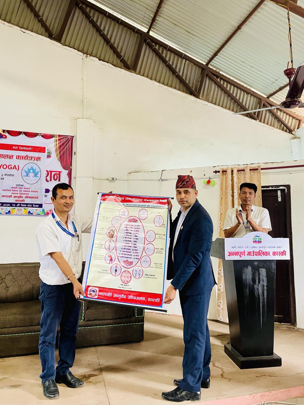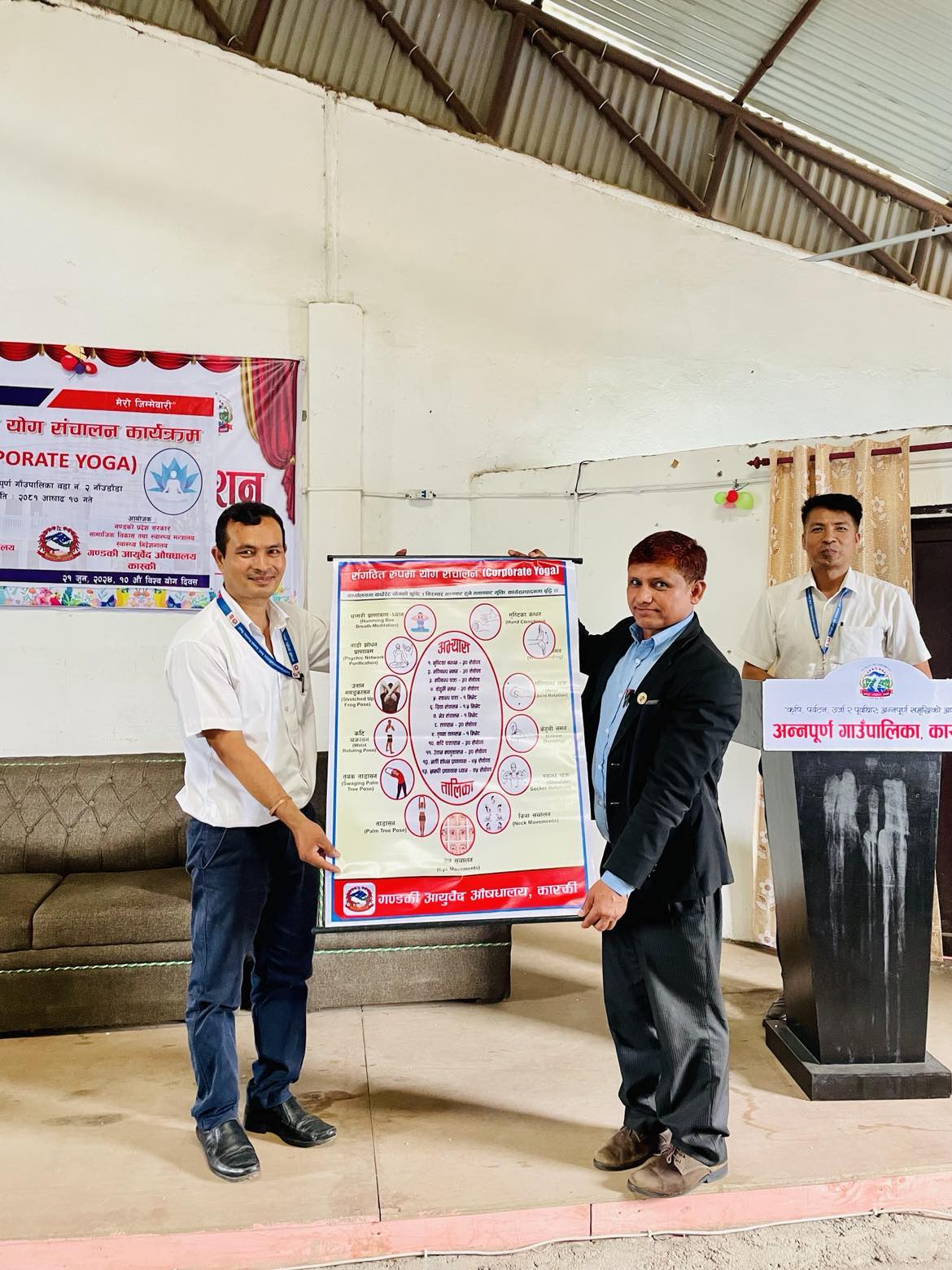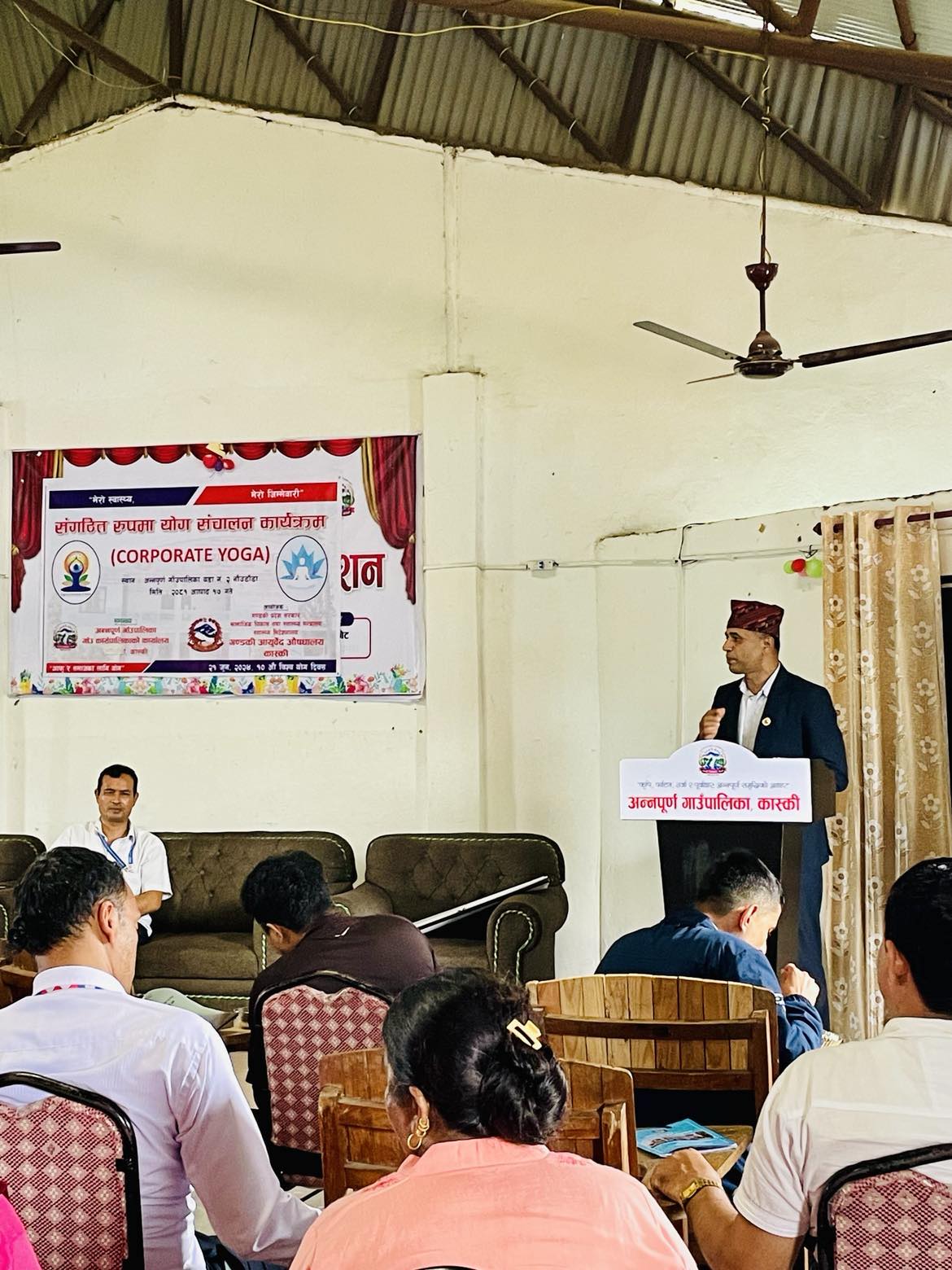 गण्डकी आयुर्वेद औषधालय प्रमुख डा.कुमार कासुला ज्यूको अध्यक्षता रहेको सो कार्यक्रममा प्रमुख अतिथि अन्नपूर्ण गाउँपालिकाका प्रमुख प्रशासकीय अधिकृत श्री विष्णु प्रसाद पोख्रेल ज्युले दैनिक राष्ट्रिय गान संगै कर्पोरेट योगको अभ्यास गरि कार्यालय शुभारम्भ गरिने र यसलाई सम्पूर्ण पालिकामा अभियानको रुपमा संचालन गरिने मन्तब्य ब्यक्त गर्नुभयो भने बिशेष अतिथि वडा नं.२ वडाध्यक्ष श्री पिताम्बर भण्डारी ज्युले कार्यक्रम पालिकामा संचालन भएकोमा धन्यवाद ब्यक्त गर्दै उपस्थित सम्पूर्ण कर्मचारीहरुलाई दैनिक कर्पोरेट योग गर्दै तनाव मुक्त भई सेवाग्राहीहरुलाई मुस्कान सहितको सेवा दिन आह्वान गर्नुभयो ।