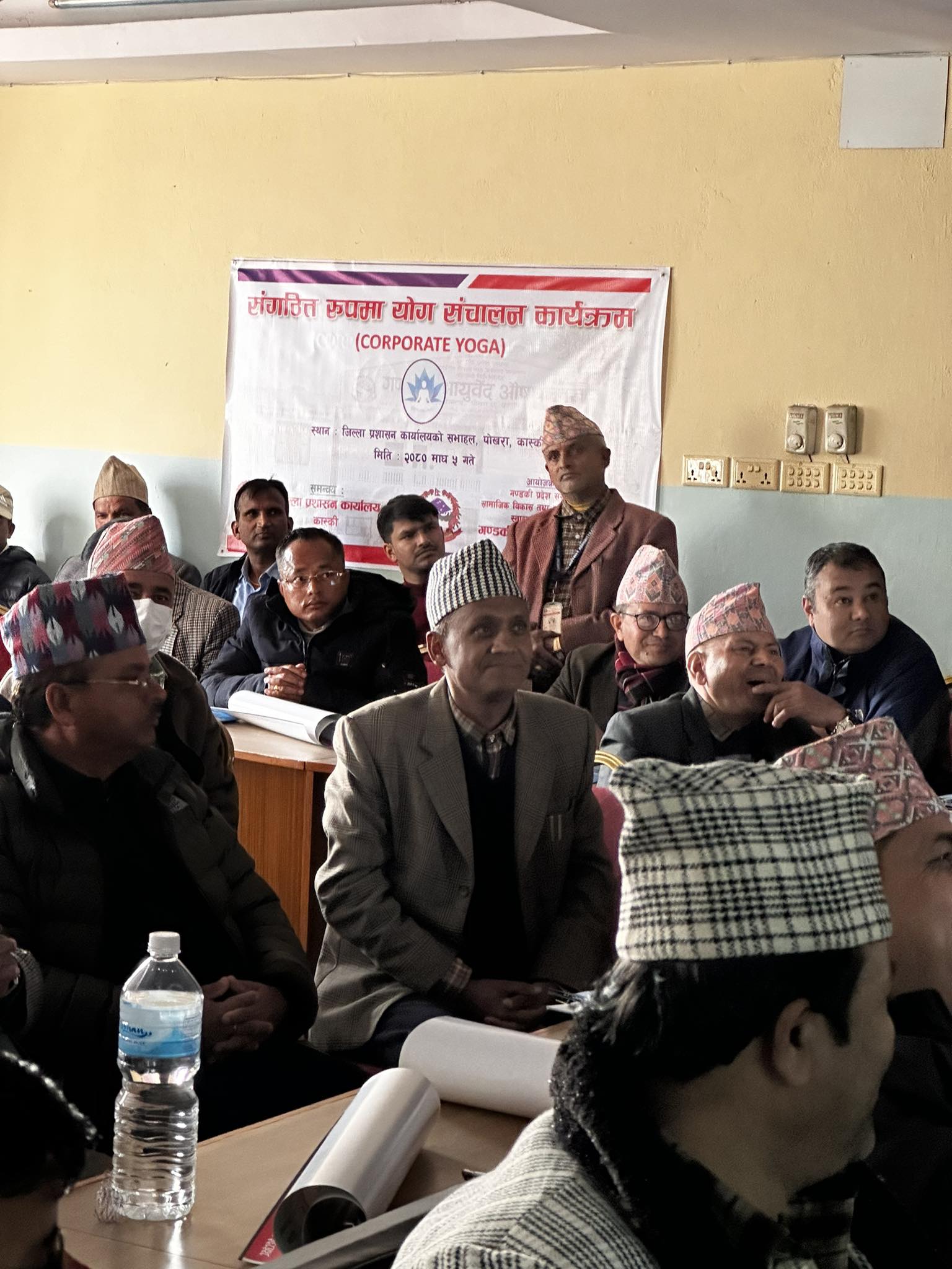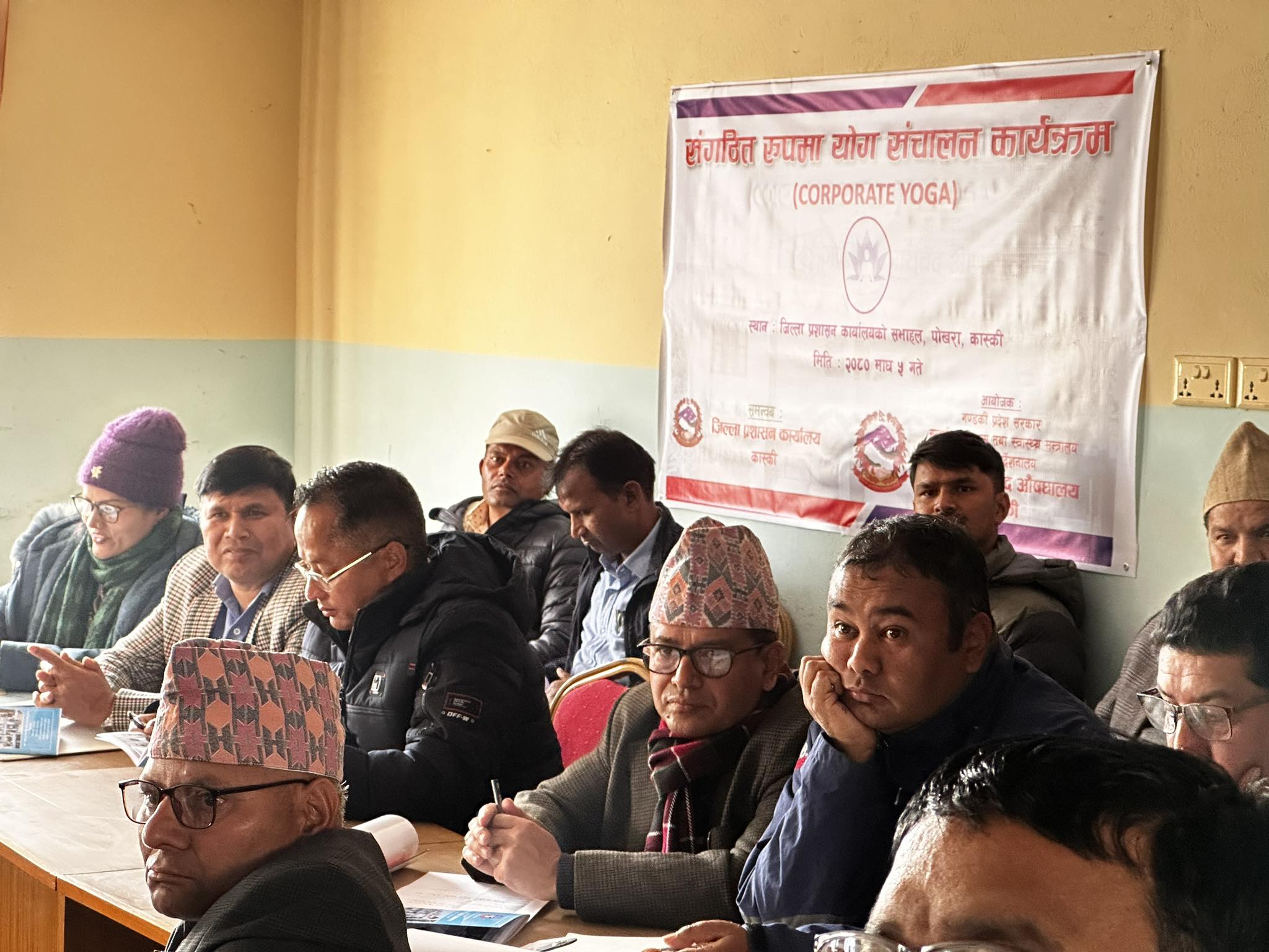 कास्की जिल्ला प्रमुख जिल्ला अधिकारी श्रीमान् वासुदेव घिमिरे ज्युको अध्यक्षतामा एबं सहायक प्रमुख जिल्ला अधिकारी द्वय श्रीमान् गंगा बहादुर छेत्री र श्रीमान् गुरुदत्त ढकाल, चार वटै सुरक्षा निकायका प्रमुखहरु, कर्मचारी मिलन केन्द्र, कास्कीका अध्यक्ष लगायत कास्की जिल्ला स्थित सम्पूर्ण कार्यालयका कार्यालय प्रमुखहरुको समुपस्थितिमा जिल्ला प्रशासन कार्यालय, कास्कीको सभाहलमा गण्डकी आयुर्वेद औषधालय, कास्की प्रमुख डा.कुमार कासुलाको योगाभ्यास प्रशिक्षण सहित सम्पन्न संगठित रुपमा योग कार्यक्रम (Corporate Yoga) मा आगामी महिना देखि प्रत्येक महिनाको ५ गते संचालन हुने कास्की जिल्ला स्थित कार्यालय प्रमुखहरुको बैठकको शुरुवात कर्पोरेट योग अभ्यासबाट शुरु गर्ने निर्यण संगै संगठित रुपमा योग कार्यक्रम (Corporate Yoga) सम्पन भएको कार्यक्रमको उदेश्य एवं स्वागत मन्तव्य डा.प्रदिप अधिकारी ज्युले राख्नु भएको थियो भने कार्यक्रमको संचालन डा.रामकृष्ण भुजेल ज्युले गर्नु भएको थियो ।