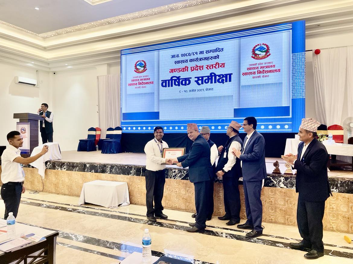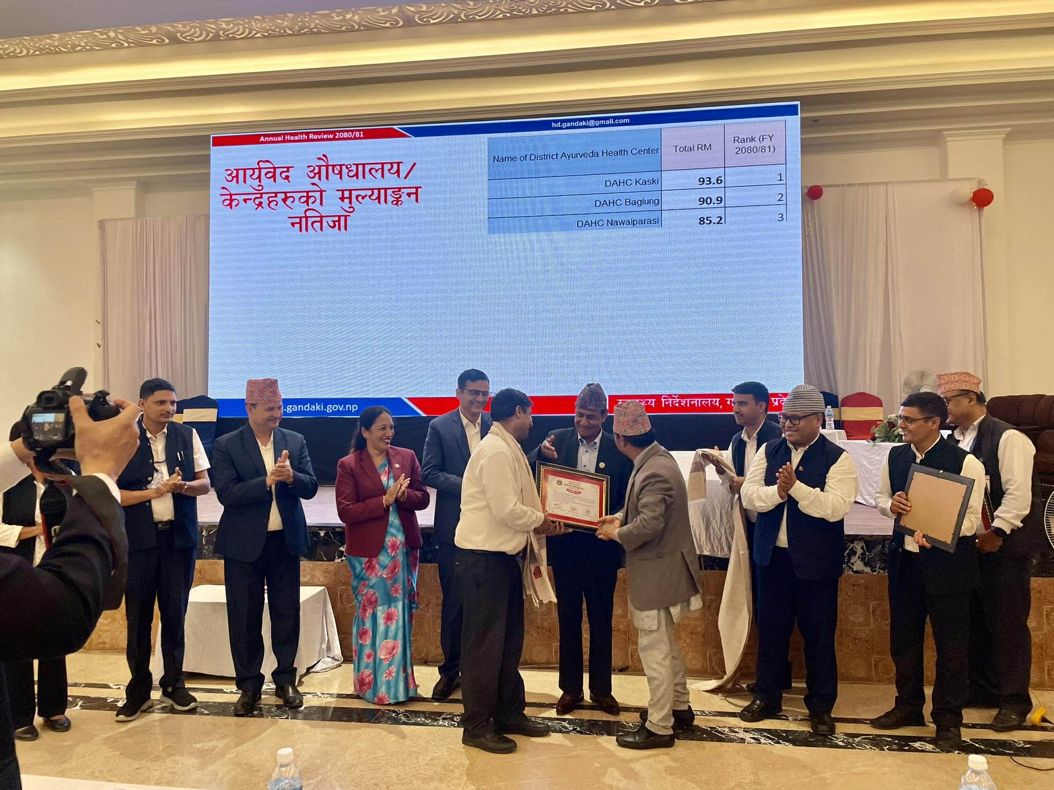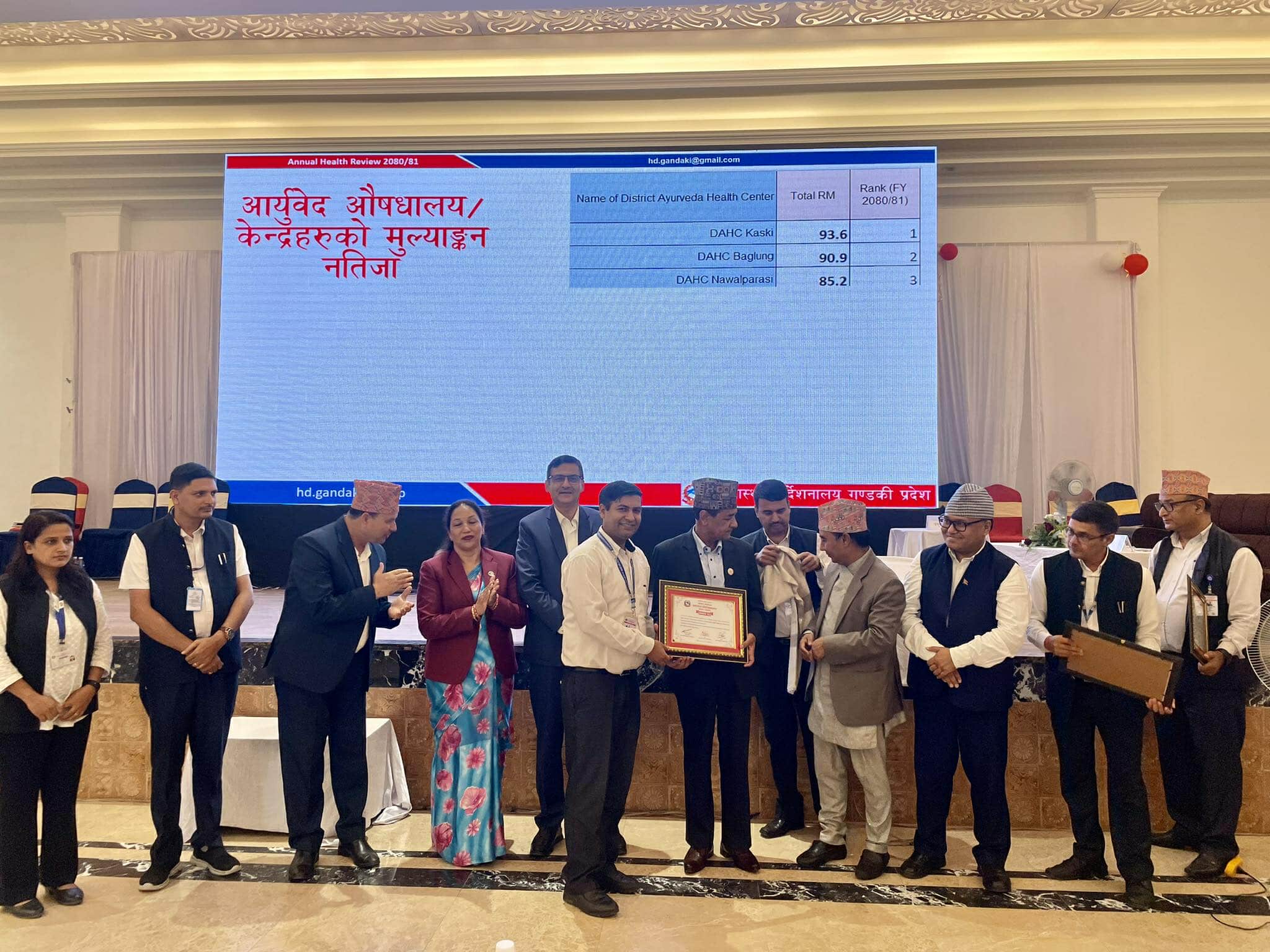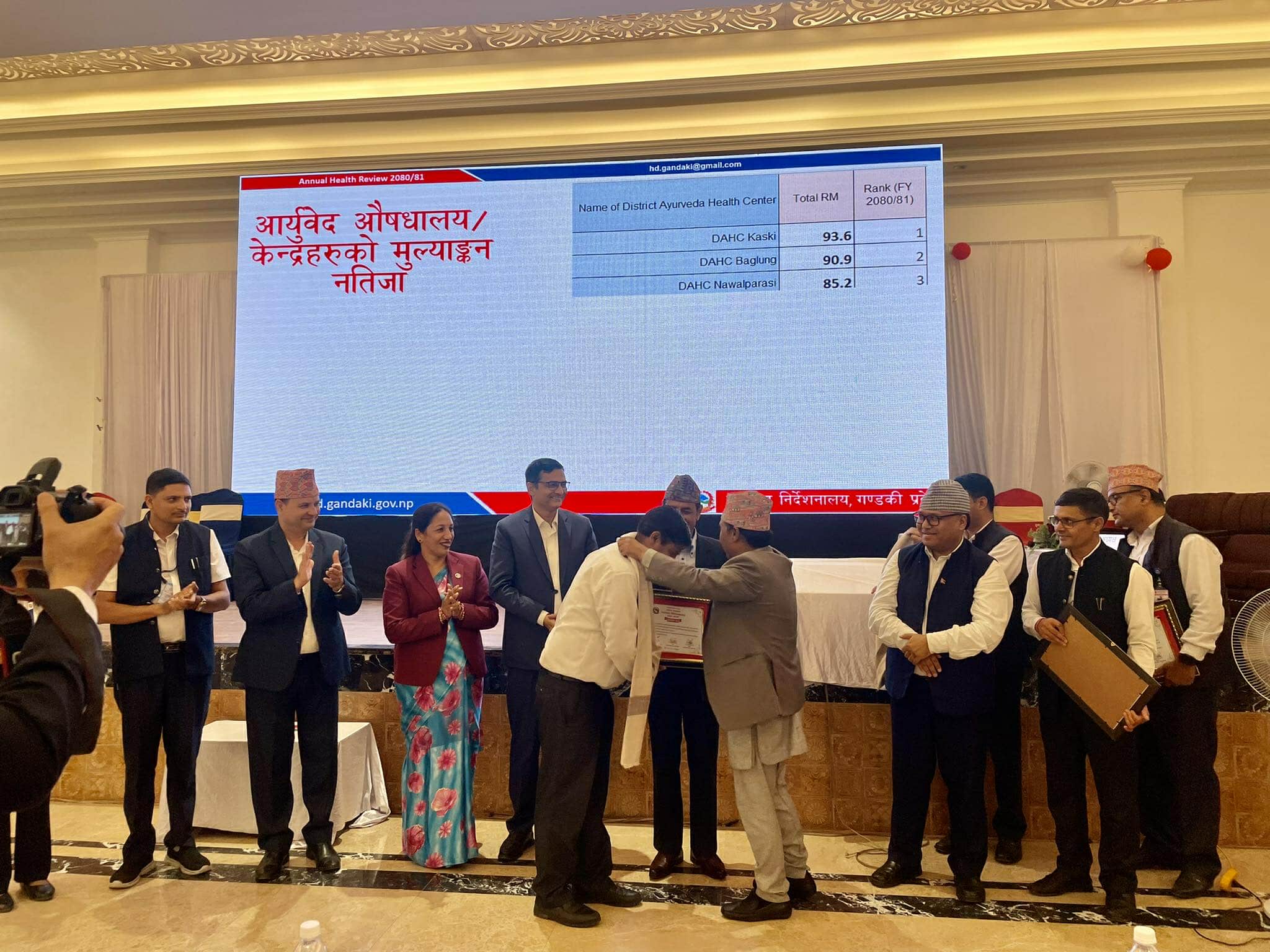 आ. व. २०८०/८१ मा सम्पादित स्वास्थ्य कार्यक्रमहरुको गण्डकी प्रदेश स्तरीय वार्षिक समिक्षा कार्यक्रम सम्पन्न भएको छ । गत आ. व. मा गरिएको कार्य सम्पादनको आधारमा आयुर्वेद तर्फ गण्डकी आयुर्वेद औषधालय, कास्की पहिलो स्थान हासिल गरेको छ । स्वास्थ्य निर्देशनालय, पोखराका महानिर्देशक खिम बहादुर खड्काले अध्यक्षता गर्नुभएको समापन कार्यक्रममा स्वास्थ्य मन्त्रालय गण्डकी प्रदेशका सचीब डा. विनोद बिन्दु शर्मा, स्वास्थ्य तथा जनसंख्या मन्त्रालयका अतिरिक्त सचीव डा. दिपेन्द्ररमण सिंह, स्वास्थ्य सेवा विभागका महानिर्देशक डा. विकास देवकोटा, बुलिङ्गटार गाउँपालिका , बडिगाड गाउँपालिका, पुतलीबजार नगरपालिका र अजिरकोट गाउँपालिका अध्यक्ष/प्रमुखहरु, गण्डकी प्रदेश सरकारका का.मू. प्रमुख सचिव रघुराम बिष्ट र स्वास्थ्य मन्त्रालय गण्डकी प्रदेशका मन्त्री माननीय कृष्ण प्रसाद पाठकज्यूले मन्तब्य राख्नुभएको थियो ।