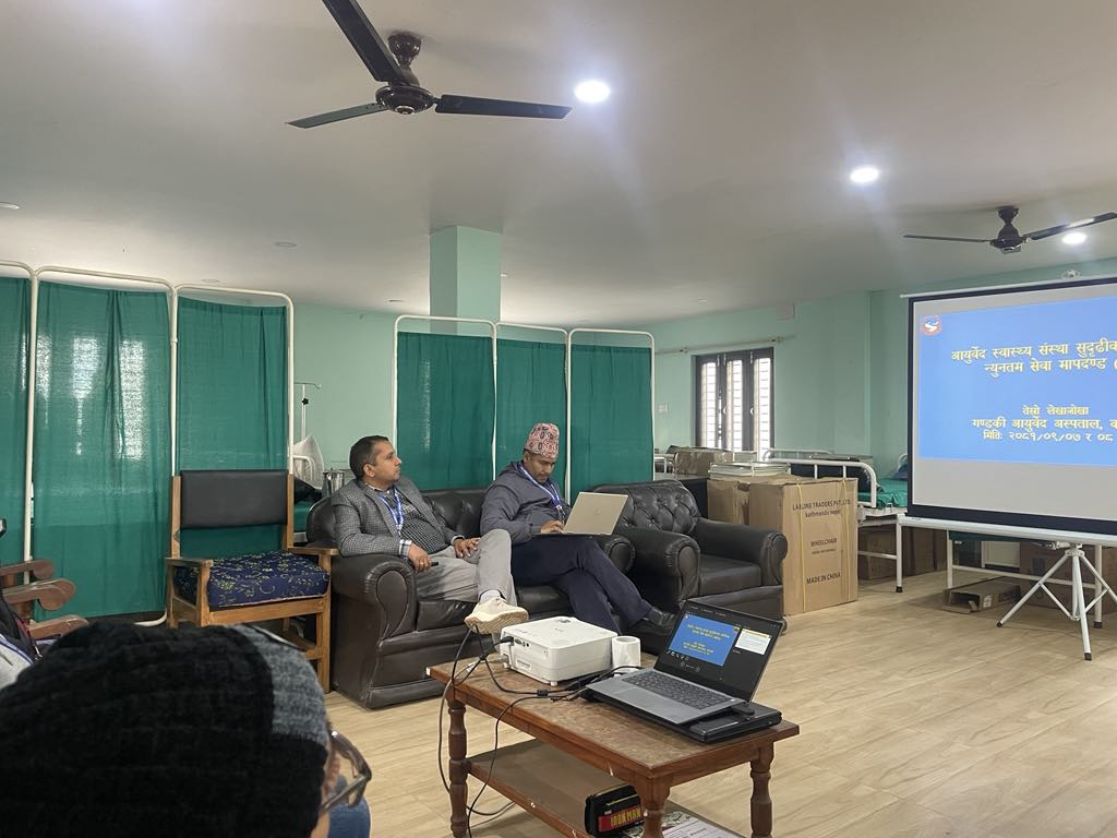 गण्डकी आयुर्वेद अस्पताल, कास्कीको न्यूनतम सेवा मापदण्डको समिक्षा र अनुगमनबाट अस्पतालको हालको अवस्था र समस्याको पहिचान भई निरन्तर सेवा सुद्विधिकरण हेतु धौलागिरी आयुर्वेद अस्पताल, बाग्लुंग प्रमुख डा.शरद पन्थी ज्युको नेतृत्वमा स्वास्थ्य मन्त्रालय, गण्डकी प्रदेश प्रतिनिधि डा. मधुर जी ढकाल, जिल्ला आयुर्वेद स्वास्थ्य केन्द्र, तनहुँ प्रमुख डा.नारायण श्रेष्ठ लगाएतको सहभागितामा मिति २०८१/०९/०७ र ०८ गते यस अस्पतालको न्यूनतम सेवा मापदण्ड तेस्रो लेखाजोखा सम्पन्न भएको छ । कार्यक्रम समापनको क्रममा संयोजक डा.शरद पन्थी ज्यूले प्रस्तुतिकरण सहित आवश्यक निर्देशन र सुझावहरु प्रदान गर्नु भएको थियो ।
