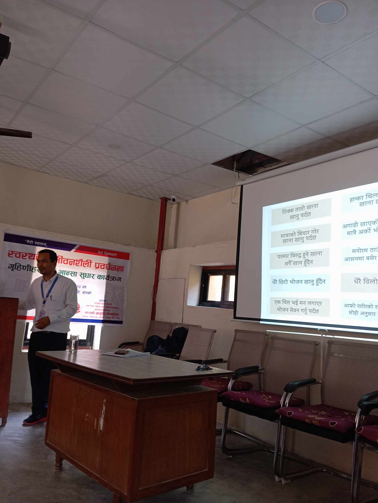 मितिि २०८० साल चैत्र १० गते शनिबारको दिन पोखरा महानगरपालिका २३ बाम्दी को वडा कार्यालयको सभाहलमा वडाध्यक्ष श्री राम काजी गुरुङको प्रमुख आतिथ्यतामा स्वस्थकर जीवनशैली प्रवर्धनको लागि गृहिणीहरुलाई भान्छा सुधार कार्यक्रम अन्तर्गत स्वास्थ्य स्वयंसेविका, आमा समुह, महिला समुह, र वडाका कर्मचारी समेत गरी ३६ जनालाई स्वस्थकर जीवनशैली योग एवं भान्छामा उपलब्ध मसलाको प्रयोग गरी साधारण रोगको उपचार गर्ने विधि सम्बन्धी अभिमुखिकरण गरियो।